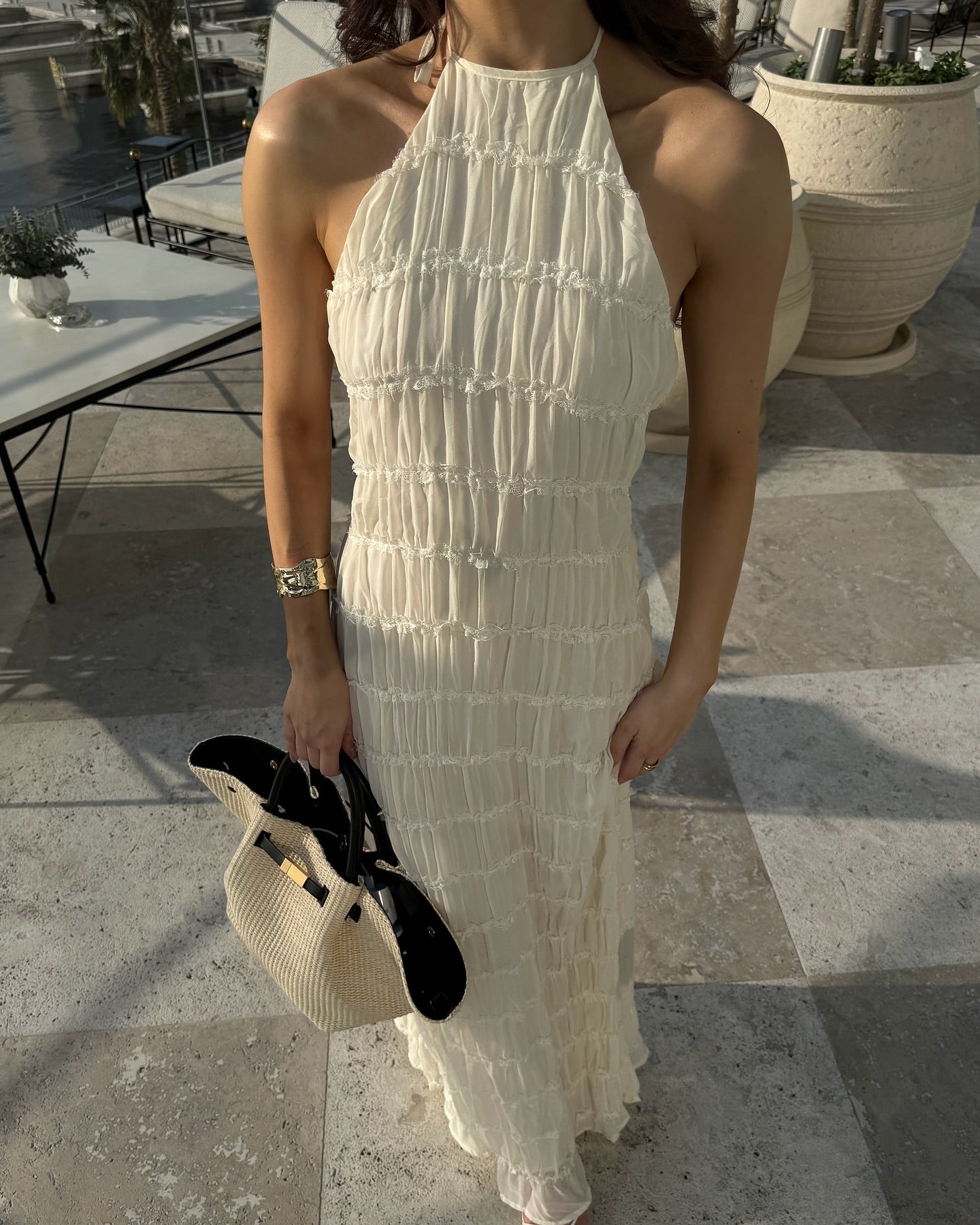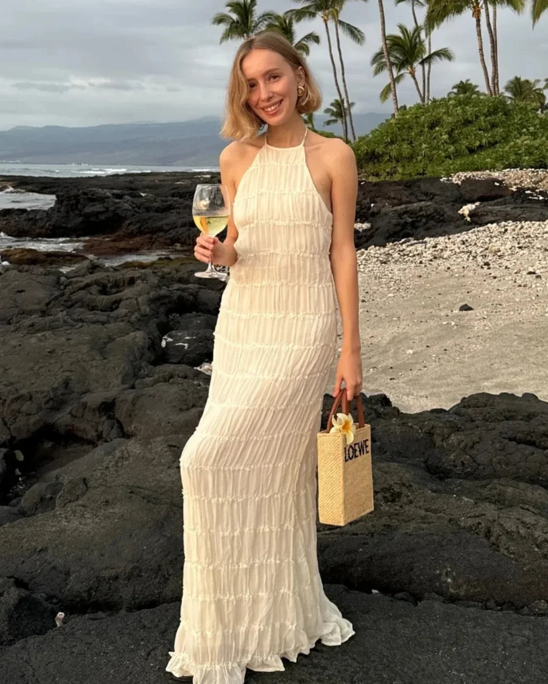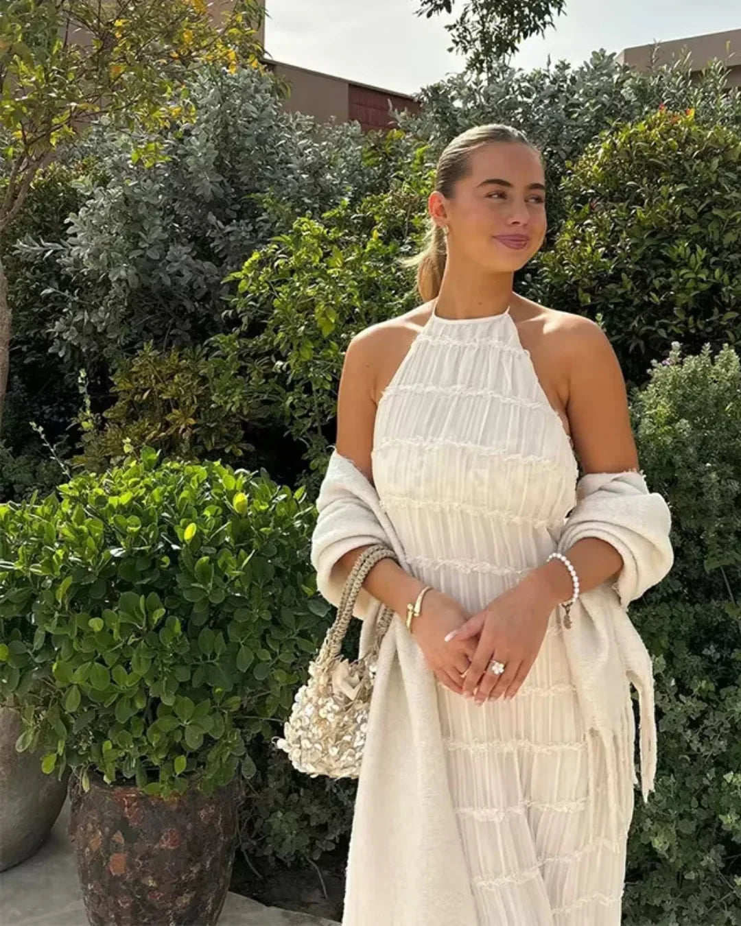 Auréline to idealna sukienka na lato, która łączy teksturę z lekkością, tworząc linię pełną spokoju i wyrafinowania. Halterowy dekolt subtelnie odsłania ramiona i szyję, a wiązanie przy karku wprowadza delikatny, niemal biżuteryjny akcent. Falbanki tkaniny nadają całości miękką objętość, która porusza się z każdym krokiem. Plecy pozostają odkryte, jedynie przelotnie oplecione cienkimi paskami, które utrzymują konstrukcję z lekkością i finezją. Długość maxi optycznie wydłuża sylwetkę, a ukryta podszewka zapewnia komfort i swobodę ruchu.