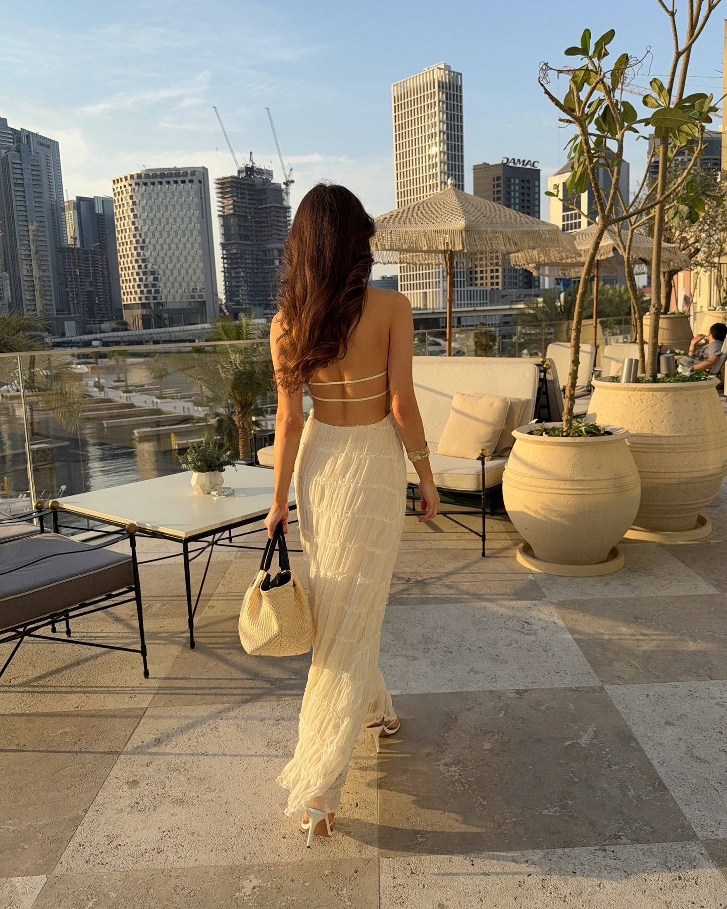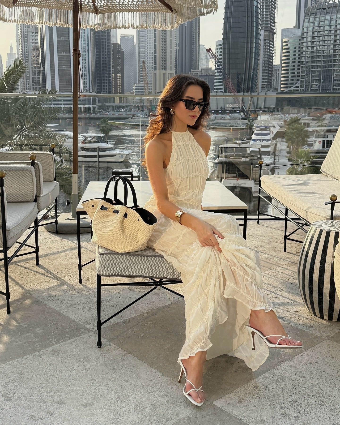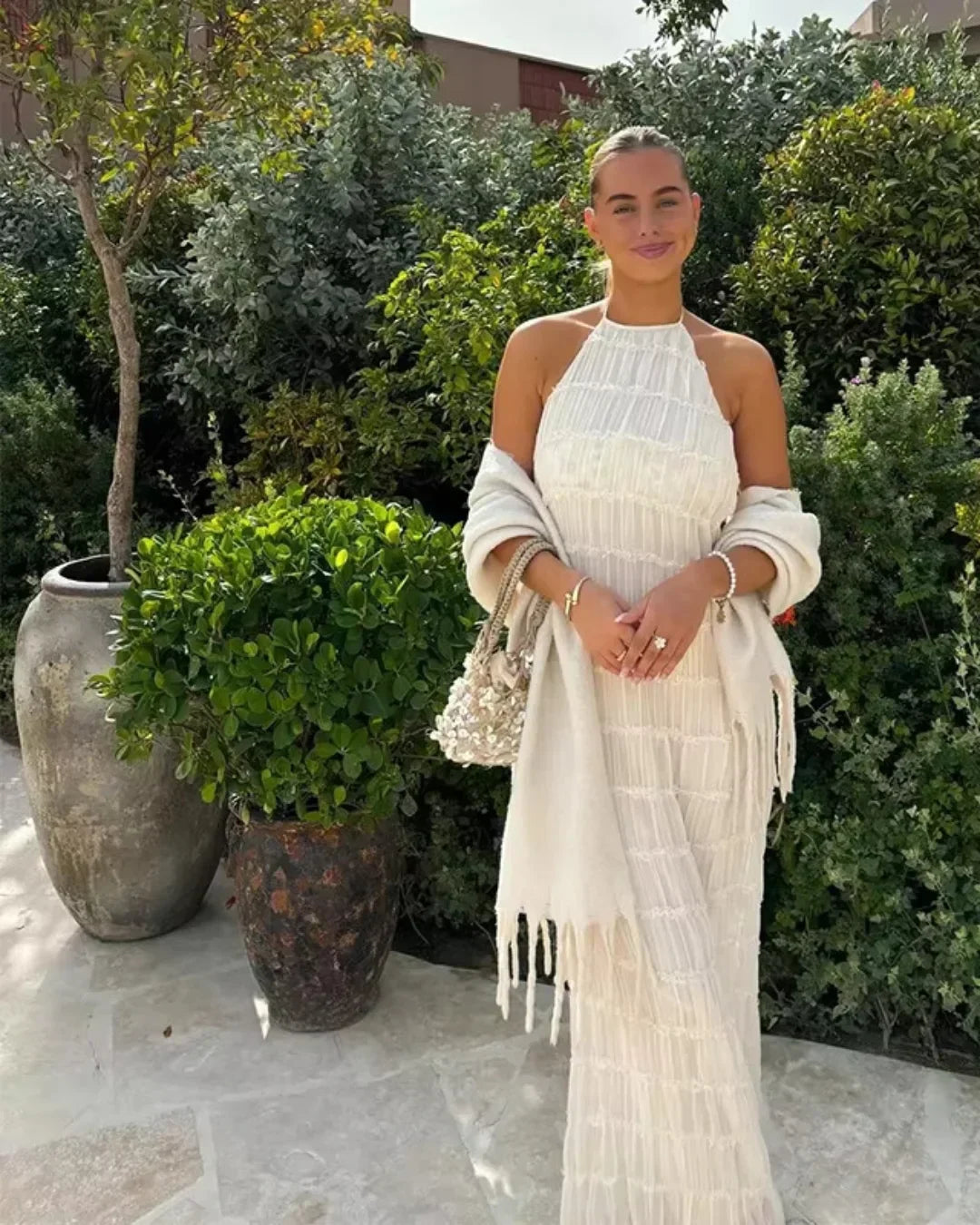 Auréline to idealna sukienka na lato, która łączy teksturę z lekkością, tworząc linię pełną spokoju i wyrafinowania. Halterowy dekolt subtelnie odsłania ramiona i szyję, a wiązanie przy karku wprowadza delikatny, niemal biżuteryjny akcent. Falbanki tkaniny nadają całości miękką objętość, która porusza się z każdym krokiem. Plecy pozostają odkryte, jedynie przelotnie oplecione cienkimi paskami, które utrzymują konstrukcję z lekkością i finezją. Długość maxi optycznie wydłuża sylwetkę, a ukryta podszewka zapewnia komfort i swobodę ruchu.
